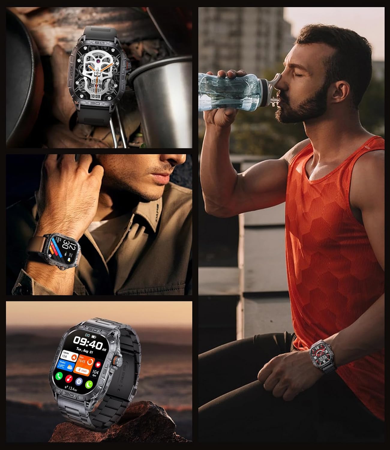 - 【Military-Grade Durability & Exquisite Design】: The military smartwatch for men has passed multiple durability tests, including shock and water resistance, ensuring strong durability and drop resistance. Its stainless steel bezel and PC-ABS alloy bottom shell enhance durability and impact resistance. It is rated 5ATM for waterproofing. If water enters the watch, you can simply touch the screen, gently swipe down, and tap the water droplet icon to automatically expel the water.(Tip: The link contains instructional videos to help you get started with this watch more effectively.)