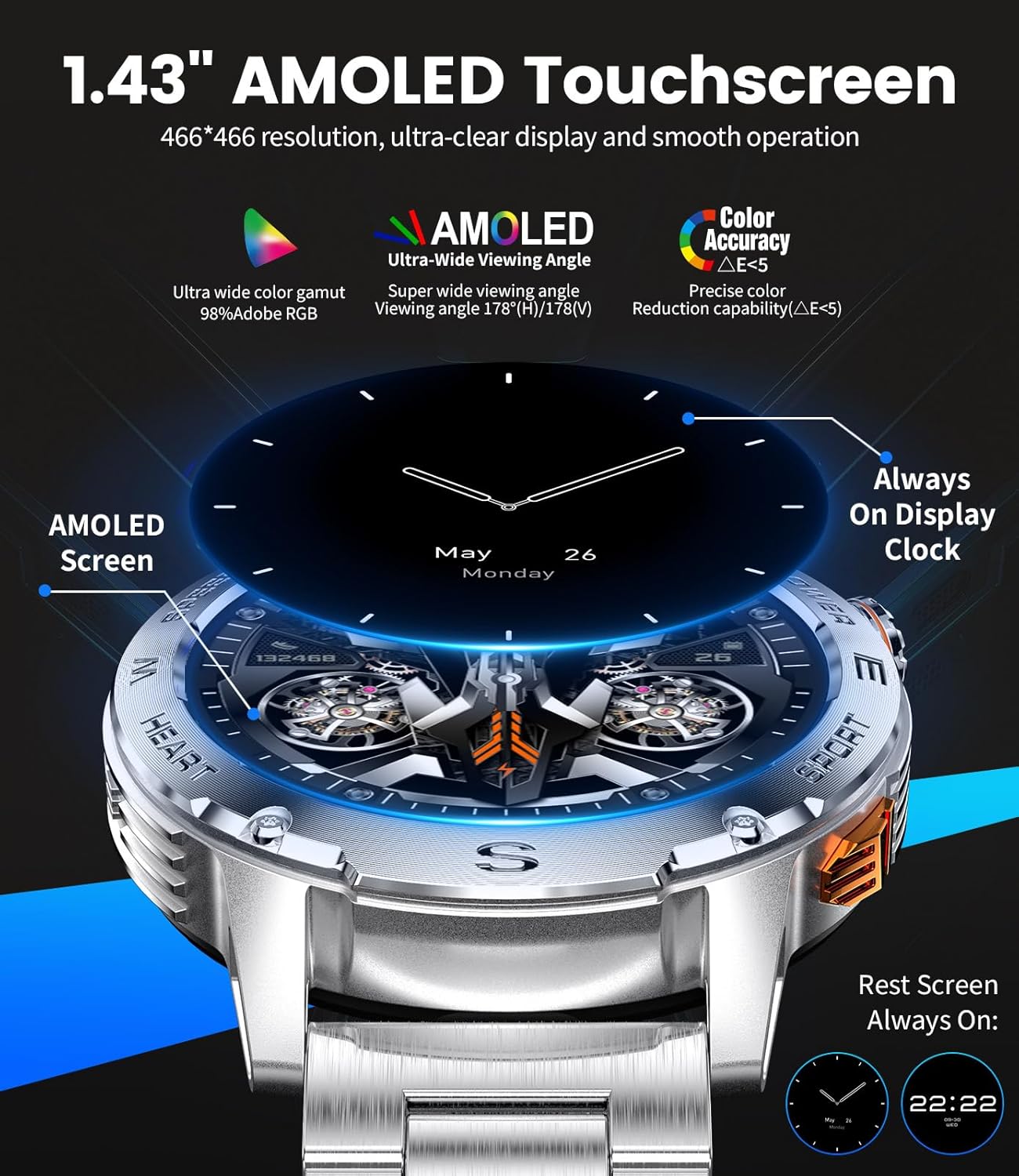 - 【466*466 AMOLED screen】1.43'' AMOLED touchscreen with 466*466 resolution. It delivers stunning visual clarity and precise color accuracy. Whether under the blazing sun or in low-light conditions, the screen's superior reflectance ensures crystal-clear visibility.You no longer need to lift your wrist or touch the screen to check the time, the display is always on disolay.The sleek design enhances convenience, while increased energy efficiency ensures a seamless and smooth user experience.