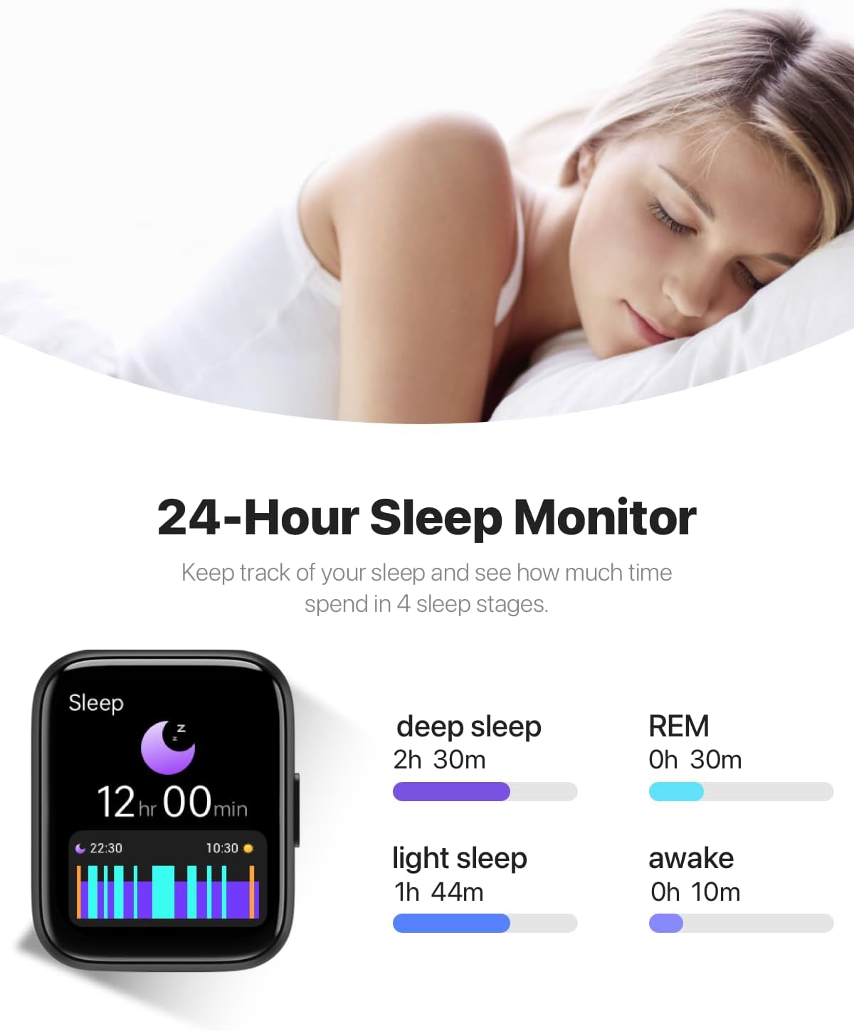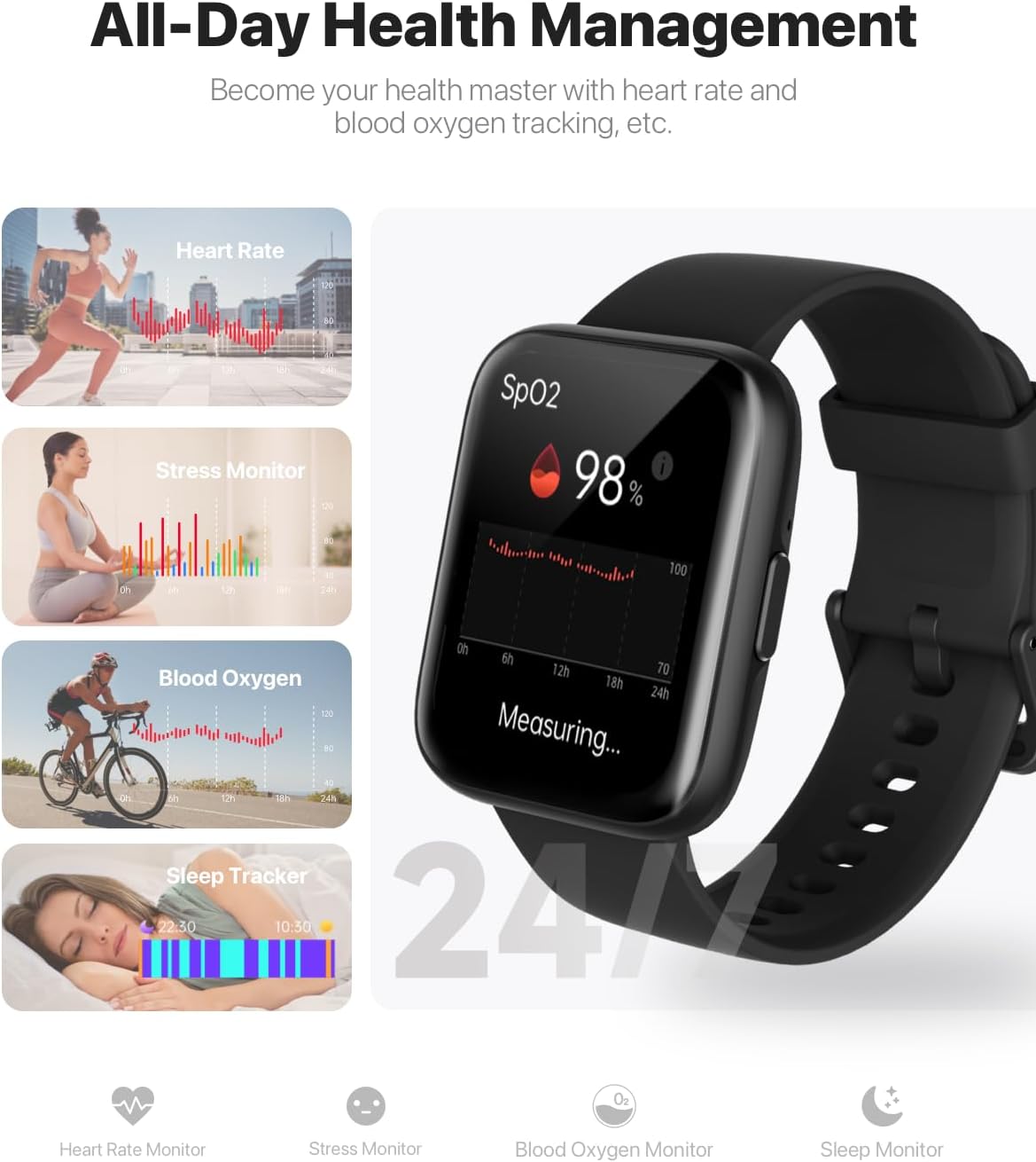 - 24/7 ACTIVITY TRACKER — Equipped with a heart rate monitor, blood oxygen monitor, and a stress monitor to keep an eye on your health around the clock. It also monitors your sleep stages, so you can clearly know the quality of sleep during REM, core sleep or deep sleep. It also synchronizes with a woman's menstrual cycle to provide predictions and reminders.