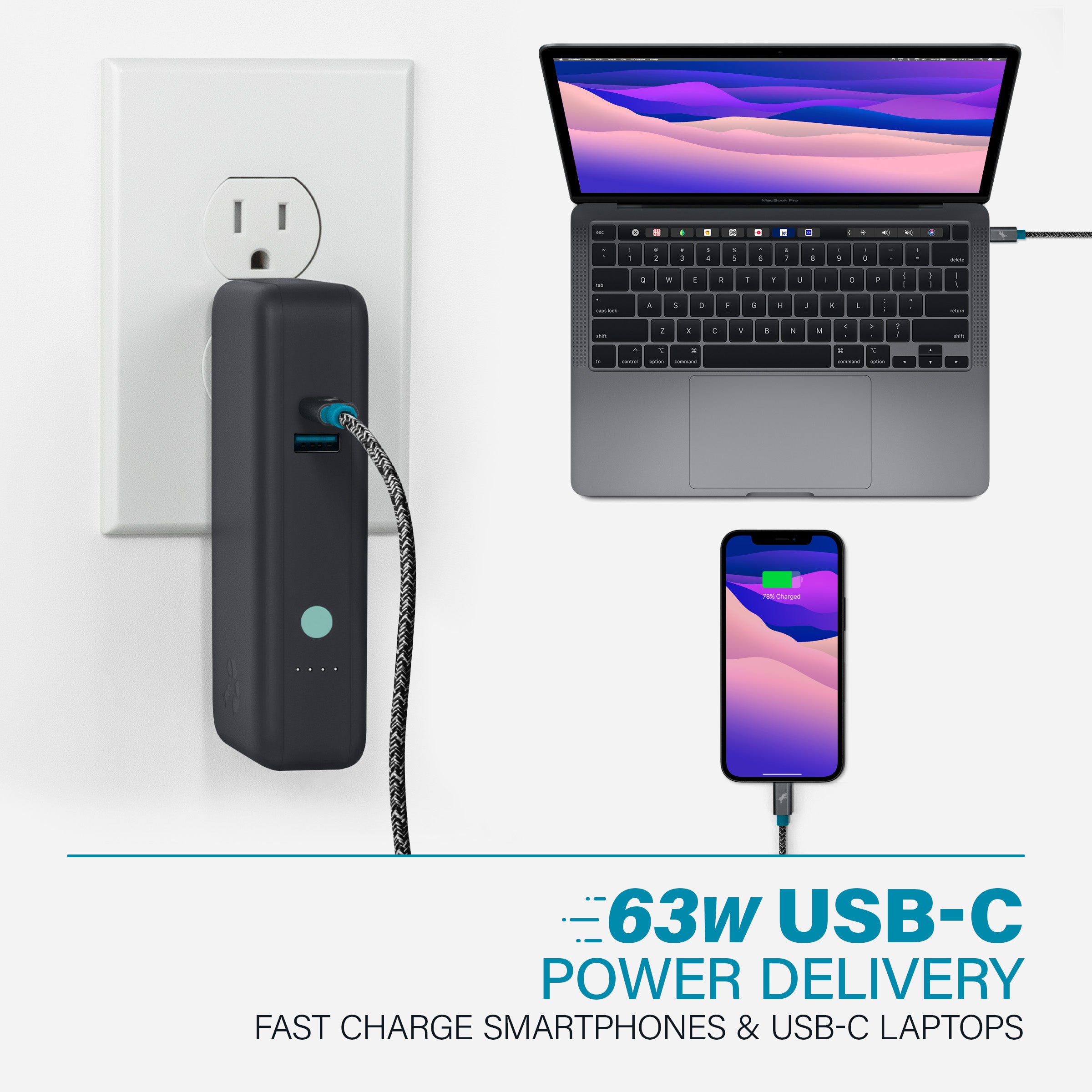 Plug it in. Charge a Macbook or USB-C powered laptop at full 60W speed - or split the charge between both ports for 45W & 18W fast charging.