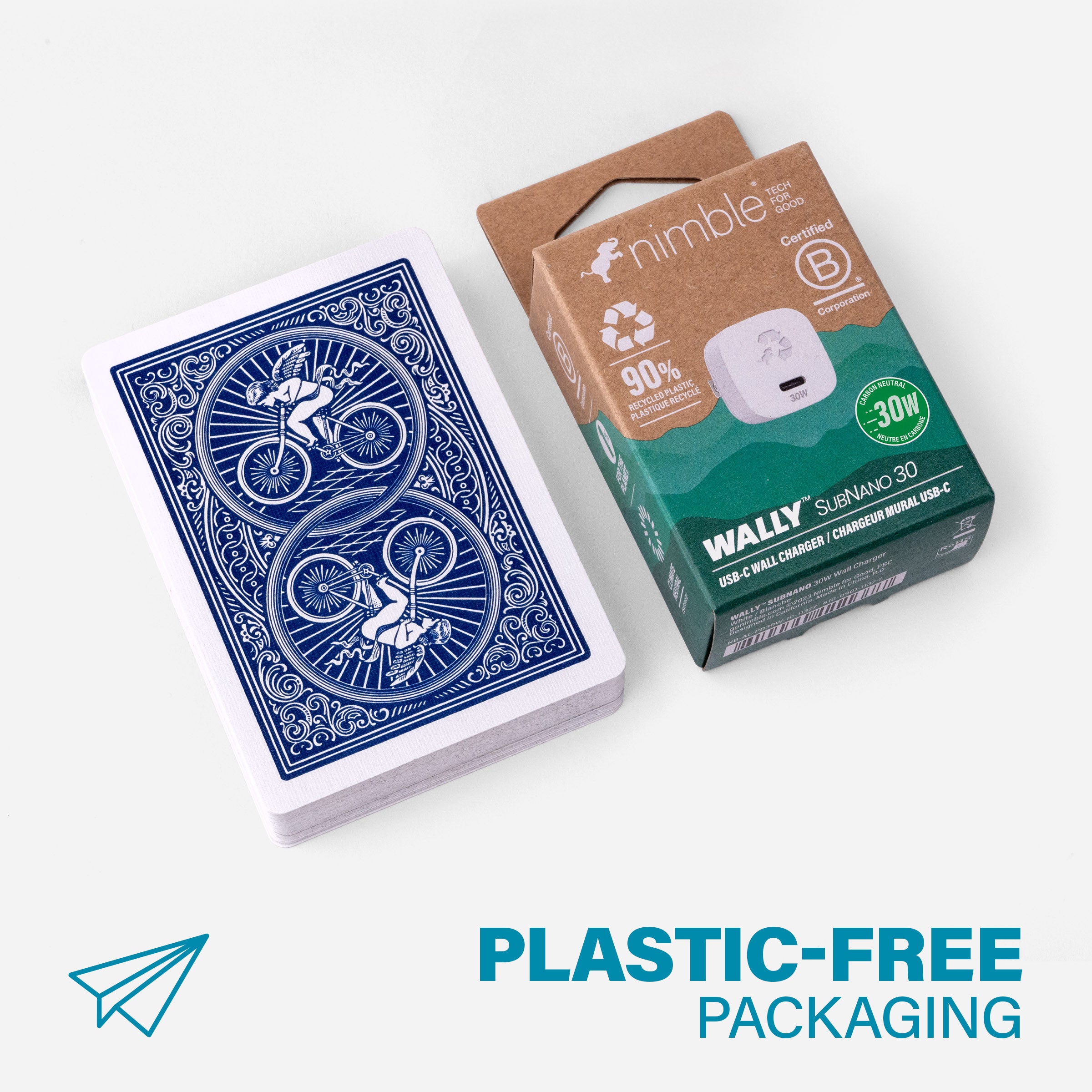 Housed in 90% post-consumer plastic and packaged in 100% recycled scrap paper, SubNano 30 offers an average savings of -6.2lb CO2e per unit compared to other wall chargers. Plus, it includes free e-waste recycling for your old tech!