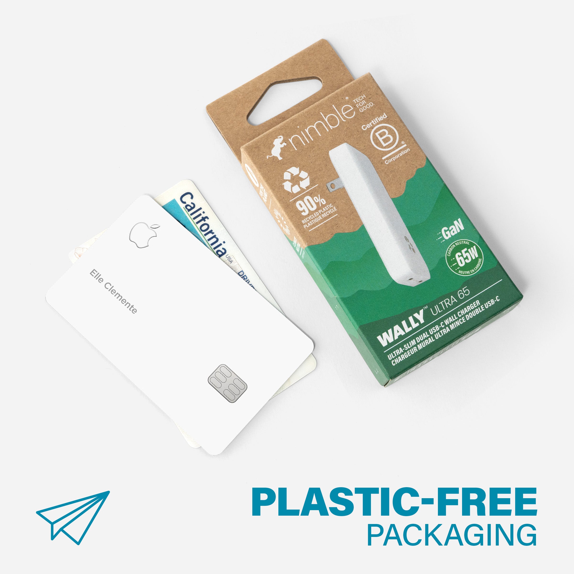 Housed in 90% post-consumer plastic, and packaged in post-consumer scrap paper for an average saving of -7.5 lbs of CO2 compared to other wall chargers. Plus, includes free e-waste recycling for your old tech!