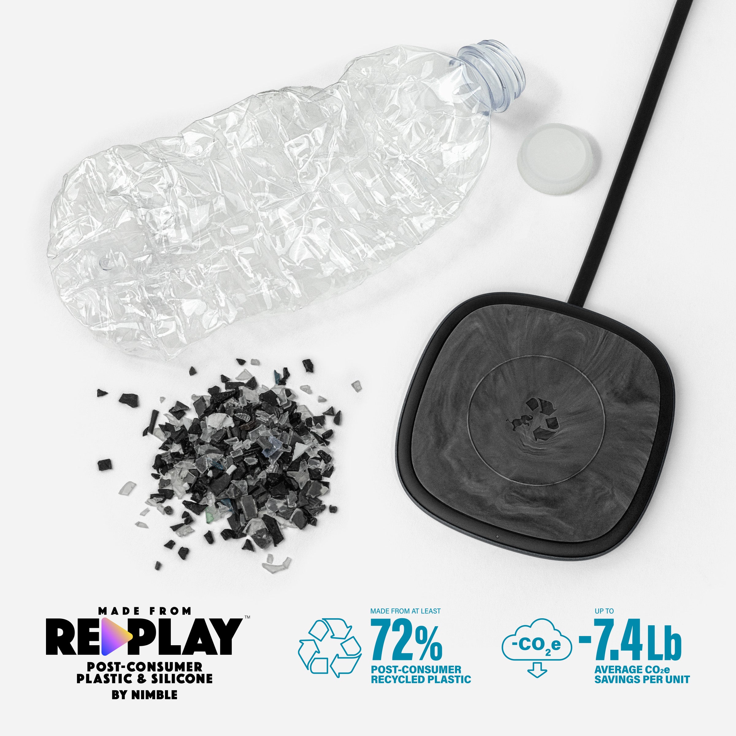 Made with post-consumer plastic, silicone and alloy to further reduce total footprint by -8.76 lbs of CO2 compared to available wireless charger alternatives.